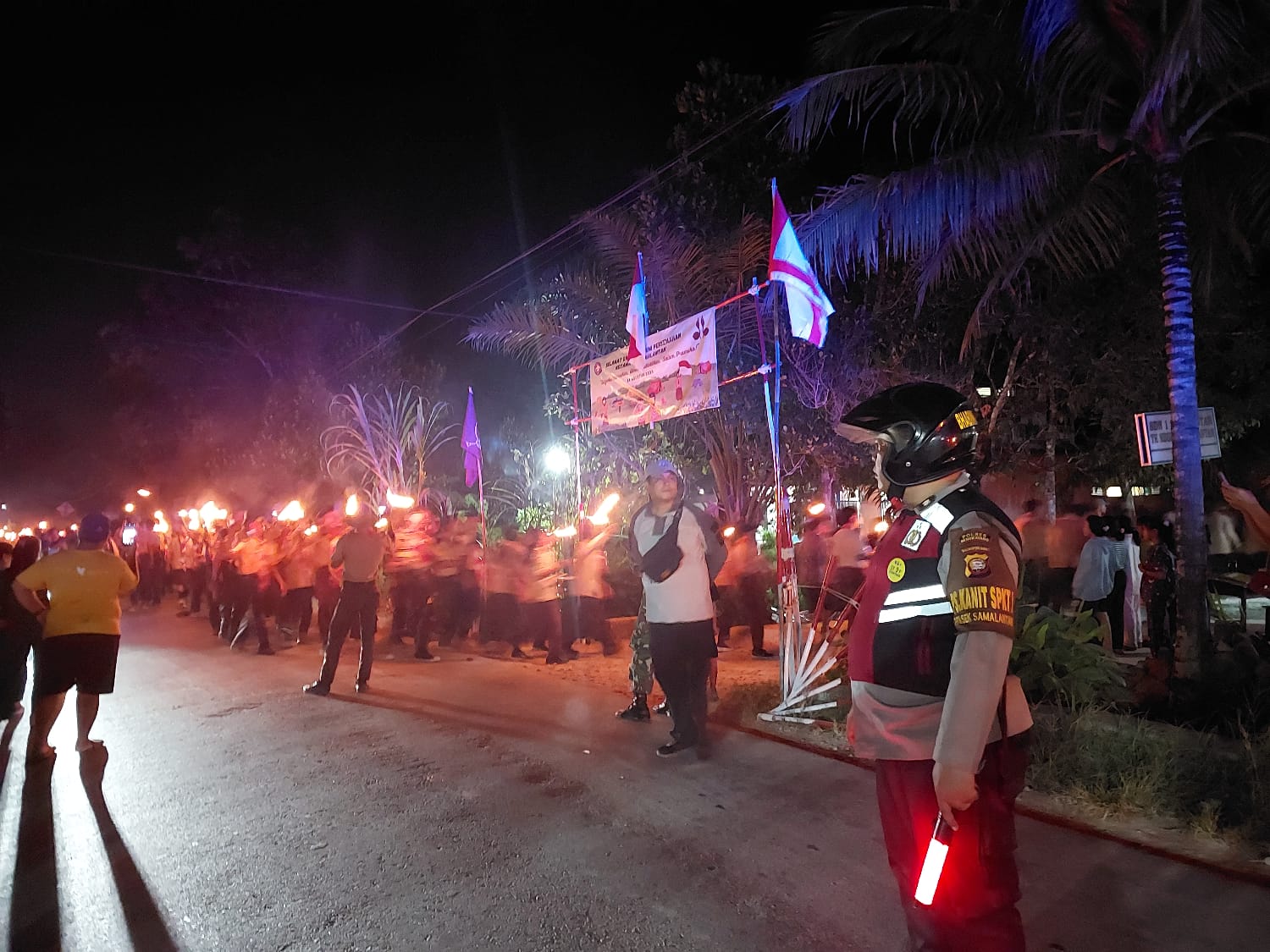 Setelah membantu menyiapkan peserta pawai obor, Kanit Binmas Aipda Parmin memberikan himbauan Kamtibmas. “Kita koordinasi dengan panitia, atur barisan pawai dan berikan beberapa himbauan”, ungkapnya. “Kita sukseskan kegiatan dan mari citakan kondusifitas wilayah”, cetus Aipda Parmin.