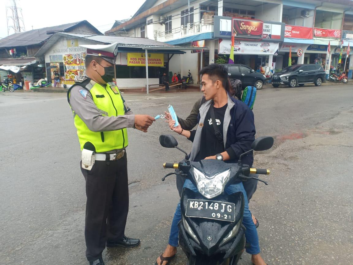 Terpantau personel Satlantas Polres Bengkayang membagikan masker gratis kepada masyarakat yang tidak gunakan masker saat keluar rumah di jalan Jerendeng AR Bengkayang.