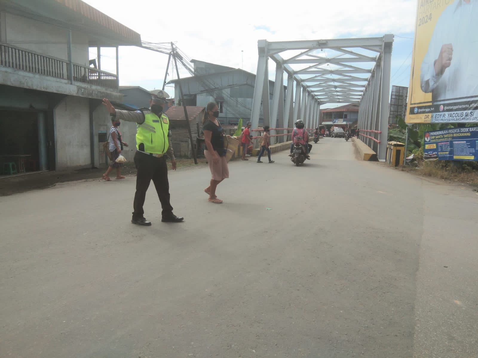 Bripka Ahjanu dan Brigadir Yeyeh melaksanakan pengaturan lalu lintas di jalan Tabrani Bengkayang tepatnya di simpang Jembatan Besi Bengkayang dengan tujuan untuk menjaga keselamatan masyarakat yg menyebrang jln dari kecelakaan lalu lintas.
