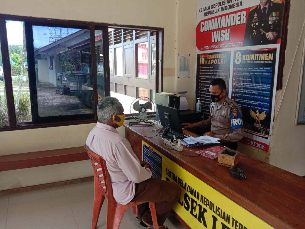 Sesuai dengan tugas rutin dan tugas pokok Kepolisian seperti yang terlihat anggota piket Spkt Polsek Ledo sedang memberikan pelayanan kepada masyarakat yang kehilangan barang/surat berharga, walaupun dalam masa Pandemi Virus Covid19 anggota polsek ledo tetap dengan semangat melaksanakan tugas melayani masyarakat.