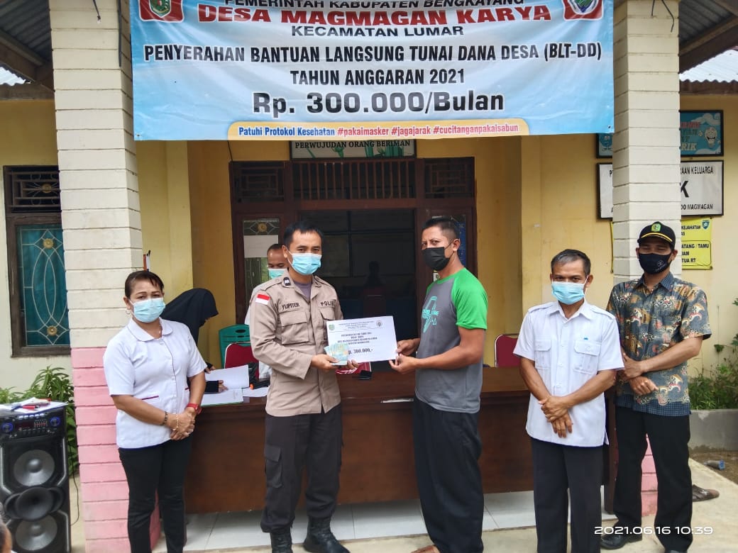 Disampaikan Kapolsek, penyaluran Bantuan Langsung Tunai ( BLT-DD ) dari Dana Desa untuk masyarakat Magmagan Karya dilaksanakan di Aula Kantor Desa Tiga Magmagan Karya dengan Penerima BLT sebanyak 74 KK, (Dusun Magmagan 63 KK, Dusun Doyot 11 KK) ,dengan Perkeluarga mendapatkan uang tunai sebesar Rp.300.000.(Tiga Ratus Ribu Rupiah).