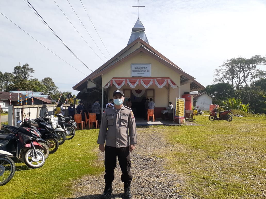 Polres Bengkayang – Anggota Polsek Ledo melakukan pengamanan ibadah minggu di gereja gereja Wilkum Polsek Ledo. Minggu/29/Juli/2021.