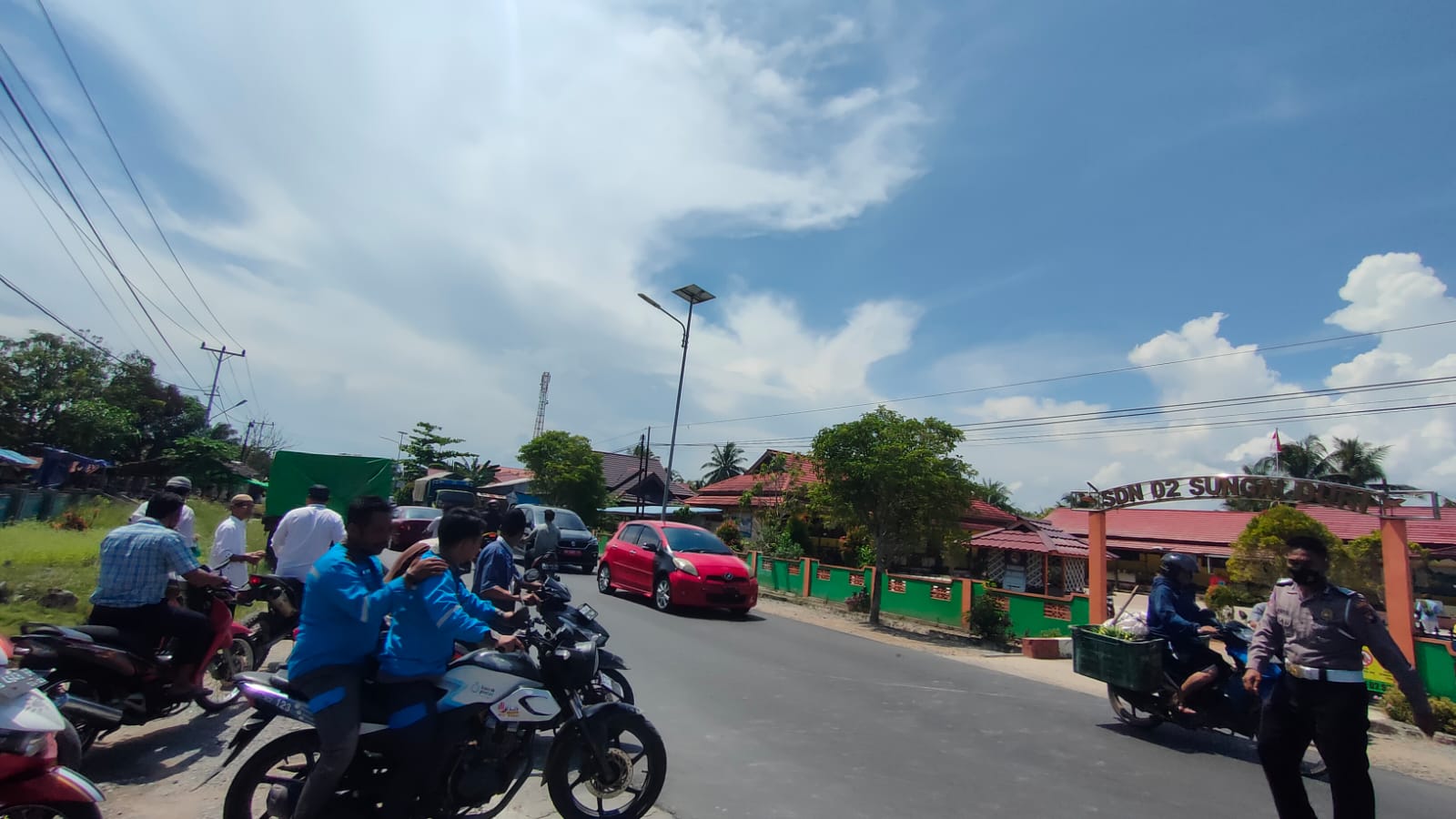 Personil Polsek Sungai Raya melaksanakan kegiatan pengaturan arus lalu lintas di depan Masjid Besar Nurudin Desa Sungai Duri.
