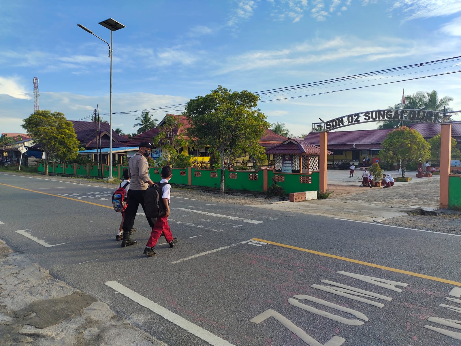 Polsek Sungai Raya – Personil Polsek Sungai Raya melaksanakan pengaturan arus lalu lintas pada pagi hari dengan rute Simpang tugu Desa Sungai Duri, simpang Jln Pramuka Desa Sungai Duri,depan Sekolah Dasar Desa Sungai Duri,depan SMP sungai Duri,simpang jalan Somban Desa Sungai Duri, depan gang Desa Sungai Jaga B, pada hari Rabu (05/01/2022).