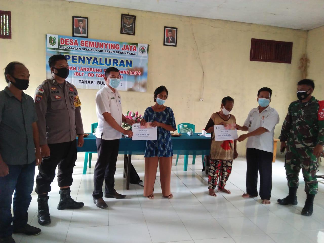 Bhabinkamtibmas desa semunying jaya brigadir ario menghadiri penyaluran BLT DD tahun 2021 di kantor desa semunying jaya kecamatan jagoi babang dan mengimbau warga penerima BLT DD untuk menerapkan prokes mencegah penularan covid 19 Rabu (7/7/2021)