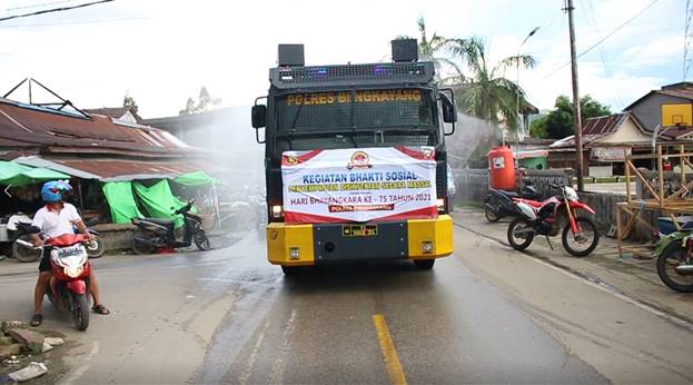 Rabu tanggal 30 Juni 2021 sekitar pukul 16.00 WIB, telah dilaksanakan penyemprotan disinfektan dengan menggunakan rantis Polri AWC (Armour Watter Canon) yang dilaksanakan di jalan raya Kab. Bengkayang.