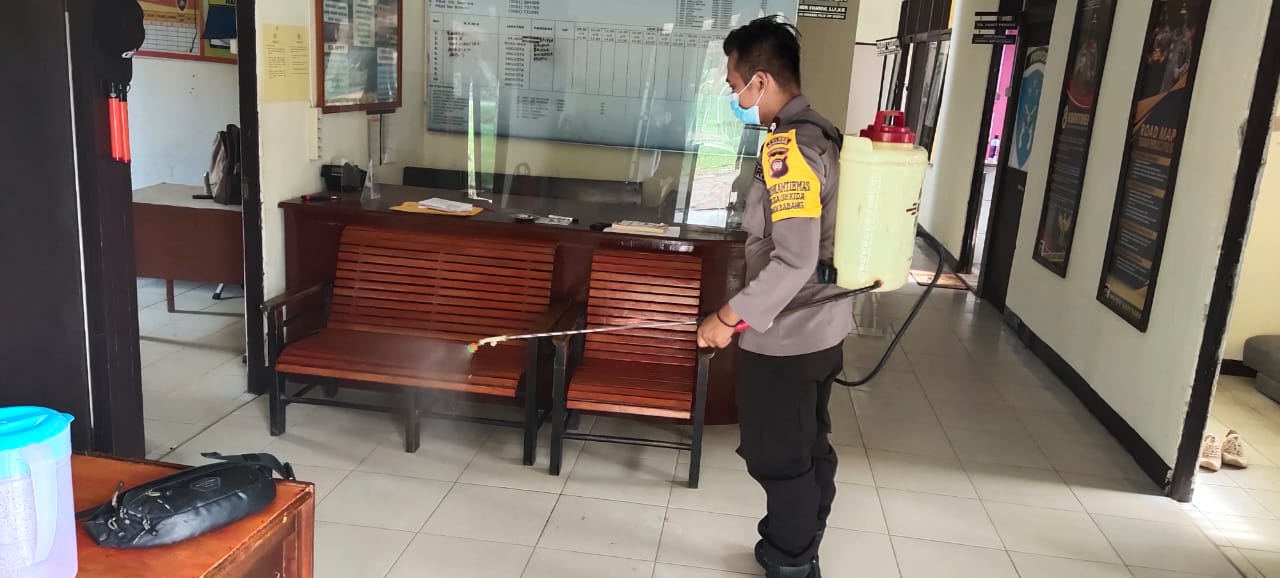 polres bengkayang, Polsek jagoi babang melakukan penyemprotan disinpektan di mako untuk mencegah dan memutus mata rantai penularan covid 19