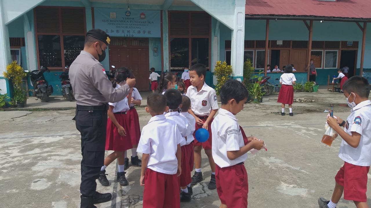 Personel Polisi dari Satuan Samapta Polres Bengkayang Polda Kalbar membagikan masker kepada para pelajar SDS Bhinneka Tunggal Ika Bengkayang, Selasa (05/10/21).