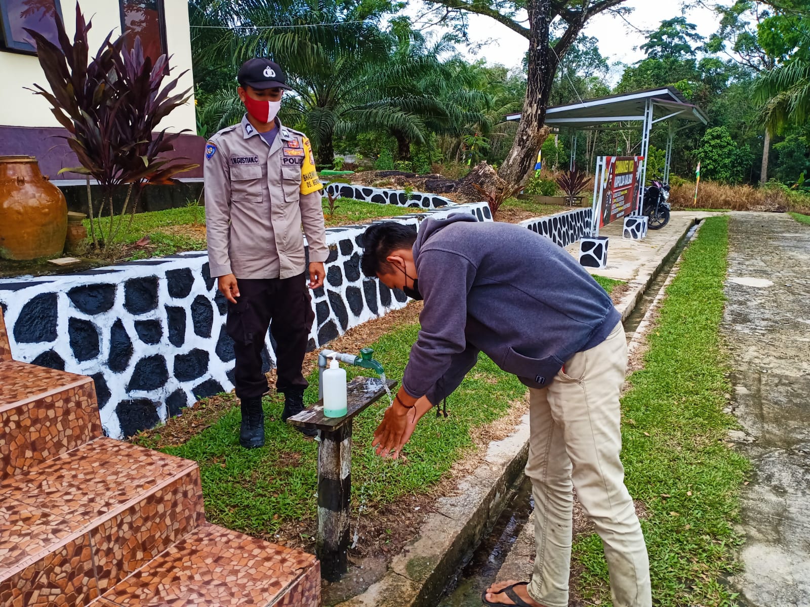 Polres Bengkayang, Polsek Monterado- Personel Polsek Monterado Brigpol Gustian terus disiplinkan masyarakat yang akan masuk ke Mako Polsek Monterado untuk mencuci tangan di tempat pencucian yang telah disediakan, Jumat(04/09/2021).