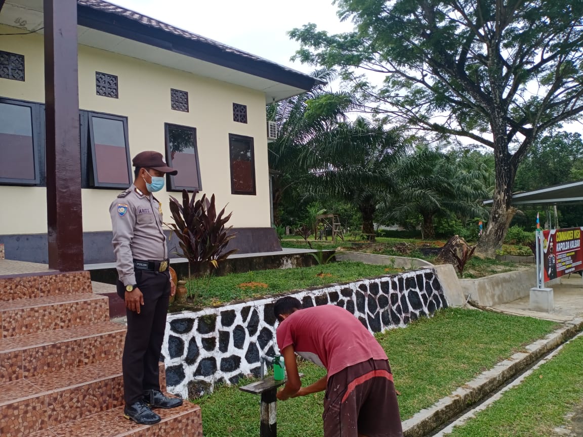 Polres Bengkayang, Polsek Monterado- Polsek Monterado terus mendisiplinkan masyarakat yang akan masuk ke Mako Polsek Monterado untuk mencuci tangan di tempat pencucian yang telah disediakan, Minggu(27/06/2021).