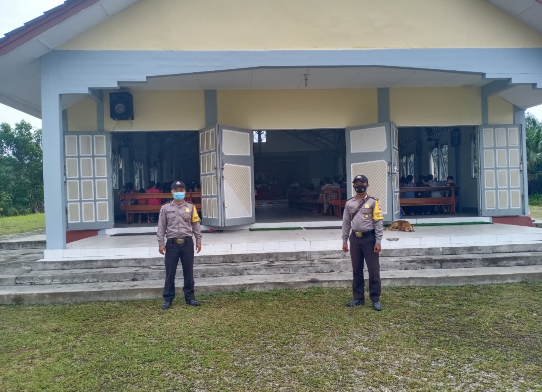 Terlihat personel Polsek Monterado Bripka Suprianus dan Briptu Aris Siswanto hadir di salah satu Gereja Katolik Santo Mikael di Desa Monterado menjaga keamanan dan kelancaran Ibadah kristiani dengan tetap mempedomani Protokol Kesehatan Covid19.