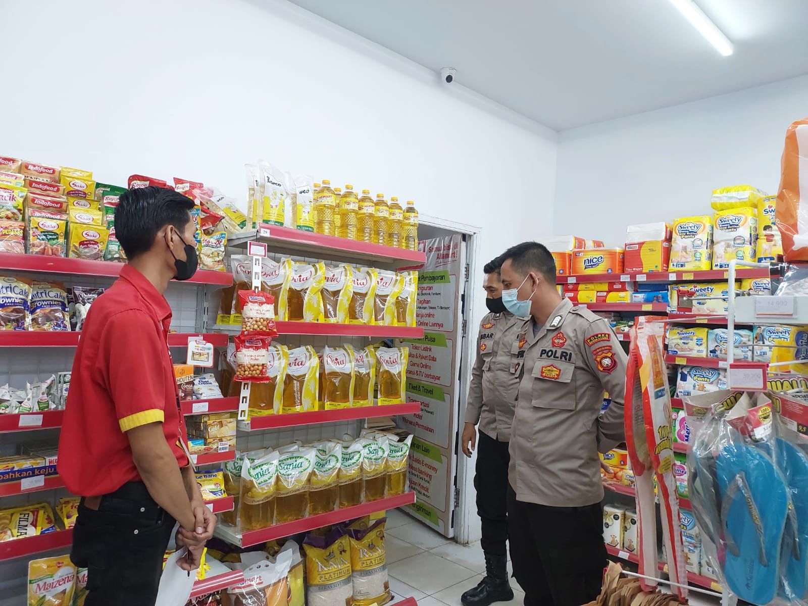 Personil Polsek Sungai Raya Kepulauan Bripka Kabar dan Bripka Taufik mendatangi salah satu Swalayan yang ada di Pasar Karimunting.