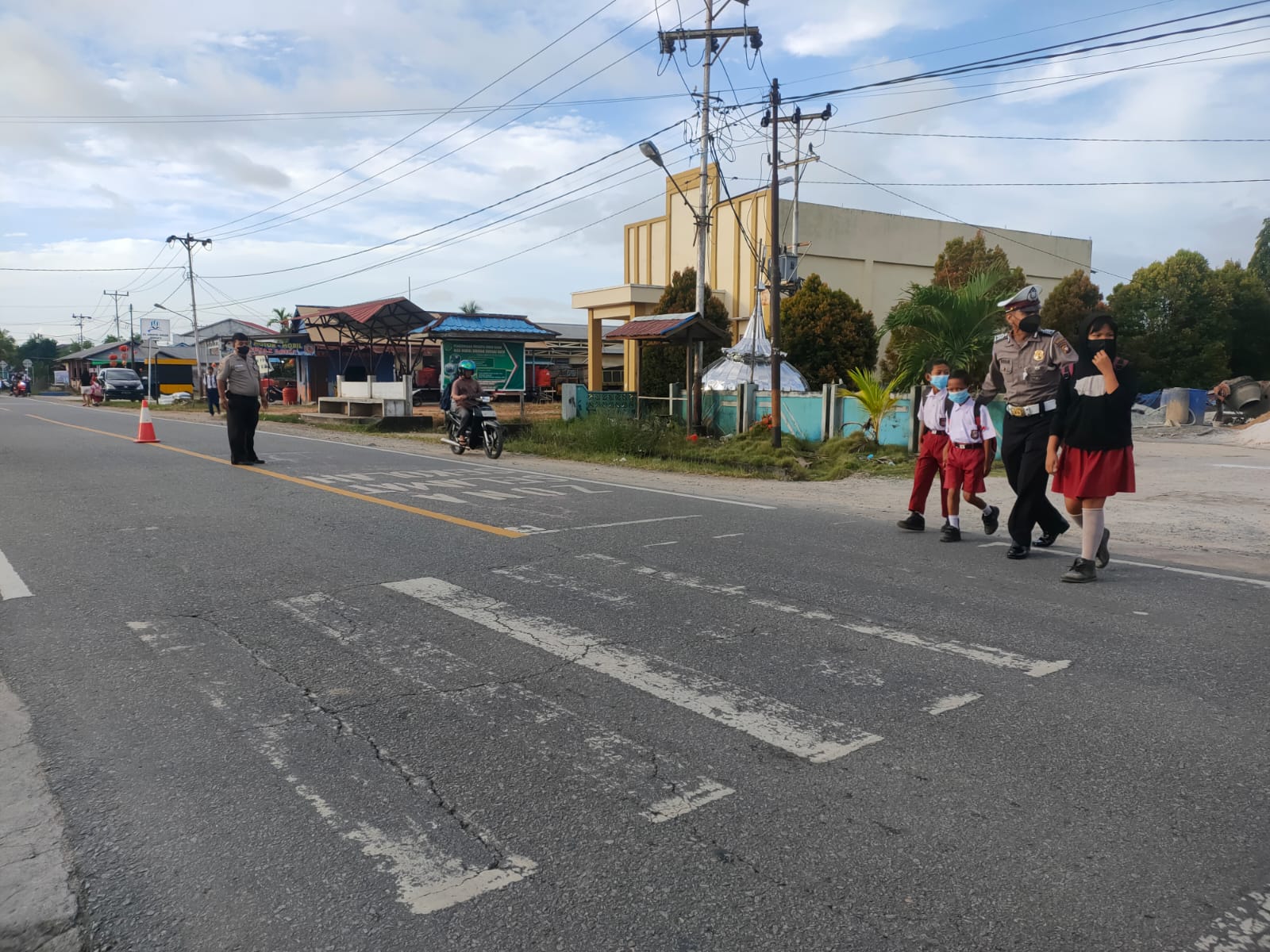 Bripka Birnatsyah melaksanakan pengaturan arus lalu lintas didepan Sekolah Dasar Sungai Duri, dan personil Lalu lintas menyebrangkan anak sekolah pada saat pergi kesekolah.