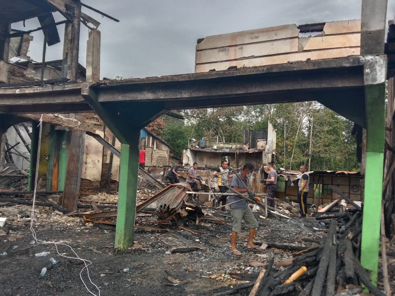 Polisi dari Polsek Ledo Polres Bengkayang Polda Kalbar ikut melaksanakan kerja bakti membersihkan bekas kebakaran ruko di Dsn. Ledo Ds. Lesabela, Kecamatan Ledo, Bengkayang. Kerja bakti dilaksanakan bersama warga sekitar lokasi kebakaran. Jumat (02/9/2022).