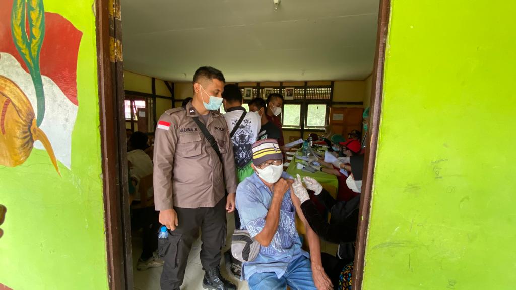 Polres Bengkayang – Kepolisian Sektor Ledo terus mengawal kegiatan penyuntikan vaksinasi Covid-19 di Dsn Bentarat Desa Lomba Karya Kecamatan Ledo pada Kamis(17/02/2022).