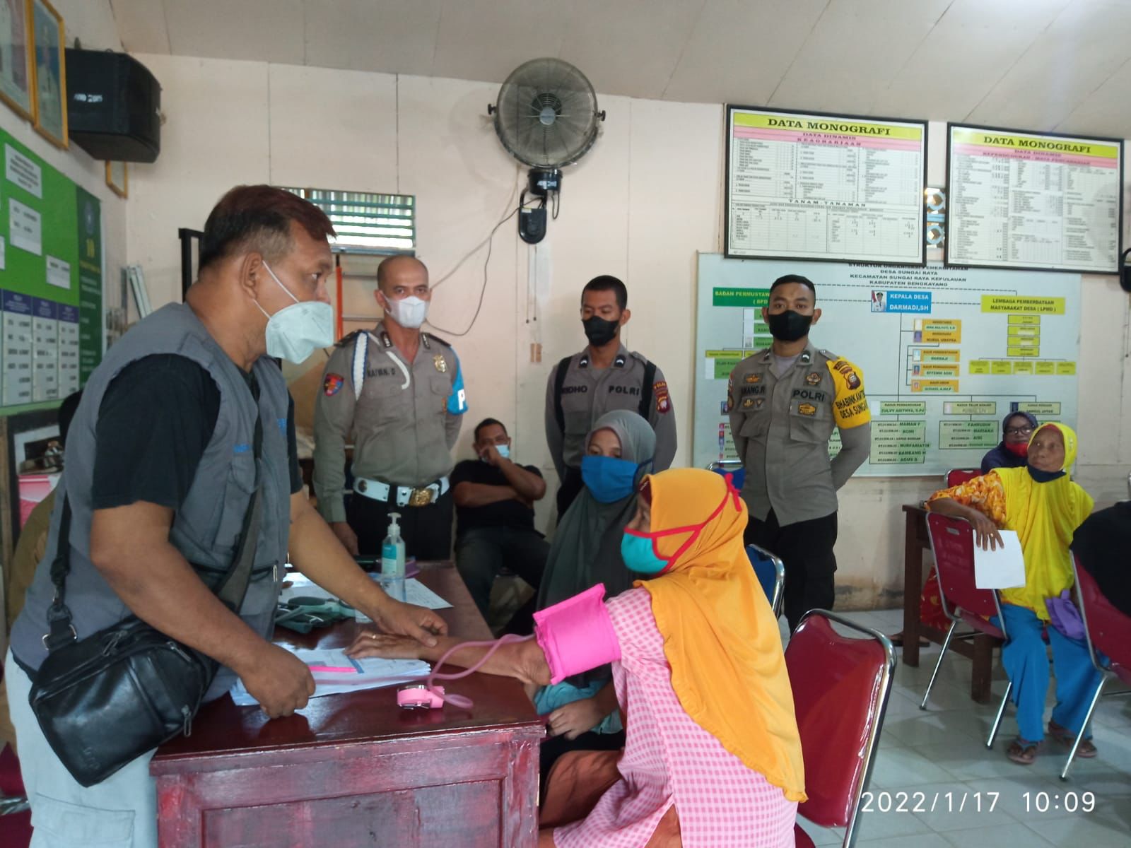 Mendukung Program Percepatan Vaksinasi Nasional, Personil polsek Sungai Raya Kepulauan melaksanakan Pengamanan dan Monitoring Vaksinasi serta bantuan bingkisan berupa beras yang dilaksanakan di Kantor Desa Sungai Raya, Desa Sungai Raya Kepulauan Kabupaten Bengkayang,Senin Pagi (17/01/2022).