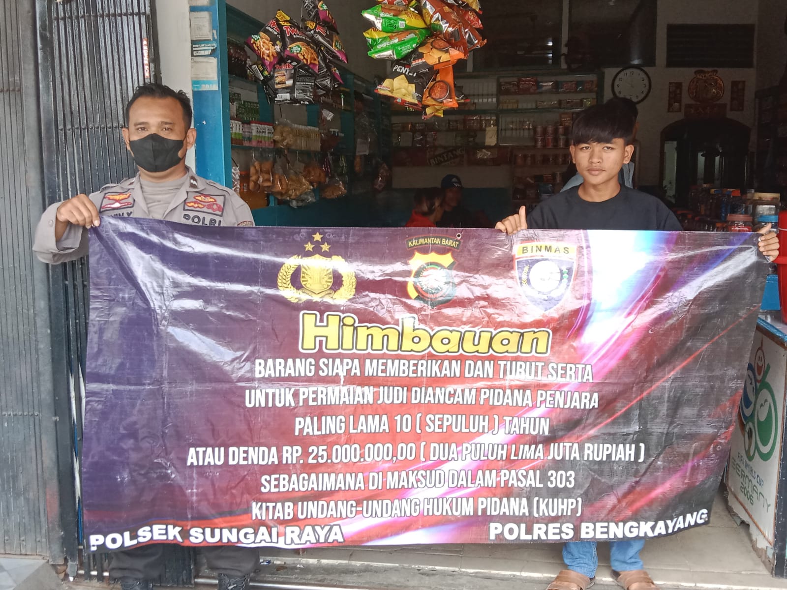 Pada kegiatan tersebut Personil Polsek Sungai Raya melaksanakan kegiatan dengan mengunakan Benner dengan isinya adalah, Himbauan’ Barang siapa memberikan dan turut serta untuk permainan judi diancam pidana penjara paling lama 10 (sepuluh) tahun atau denda 25.000.000,00 (dua puluh lima juta rupiah) sebagaimana dimaksud dalam pasal 303 Kitab undang – undang Hukum Pidana (KUHP)’.