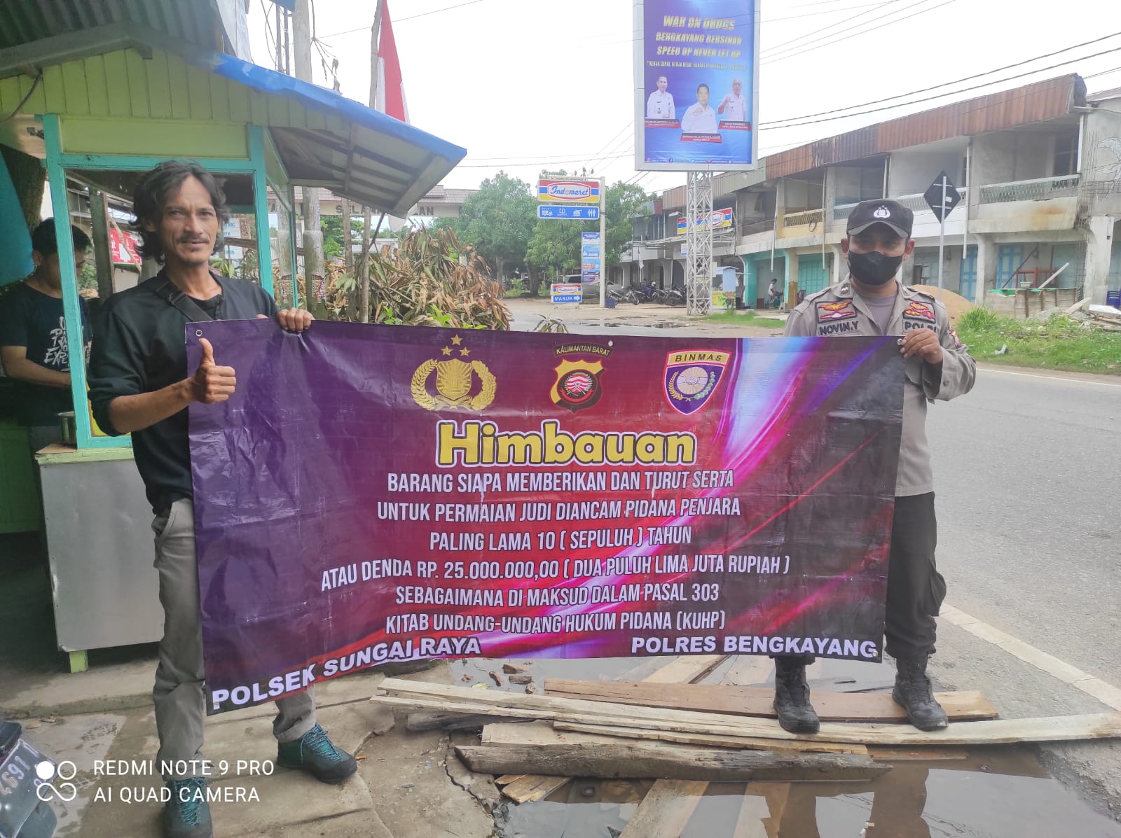Pada kegiatan tersebut Personil Polsek Sungai Raya melaksanakan kegiatan dengan mengunakan Benner dengan isinya adalah, Himbauan’ Barang siapa memberikan dan turut serta untuk permainan judi diancam pidana penjara paling lama 10 (sepuluh) tahun atau denda 25.000.000,00 (dua puluh lima juta rupiah) sebagaimana dimaksud dalam pasal 303 Kitab undang – undang Hukum Pidana (KUHP)’.