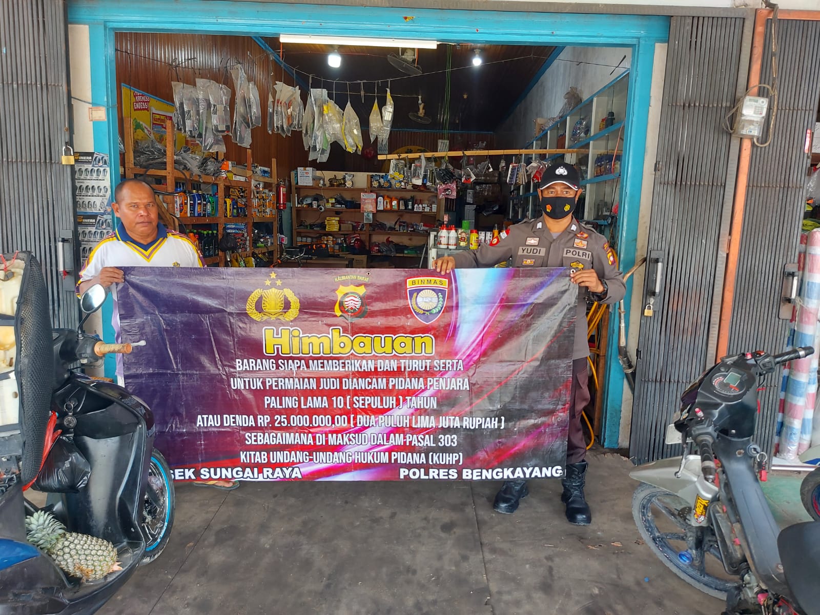 Pada kegiatan tersebut Personil Polsek Sungai Raya melaksanakan kegiatan dengan mengunakan Benner dengan isinya adalah, Himbauan’ Barang siapa memberikan dan turut serta untuk permainan judi diancam pidana penjara paling lama 10 (sepuluh) tahun atau denda 25.000.000,00 (dua puluh lima juta rupiah) sebagaimana dimaksud dalam pasal 303 Kitab undang – undang Hukum Pidana (KUHP)’.