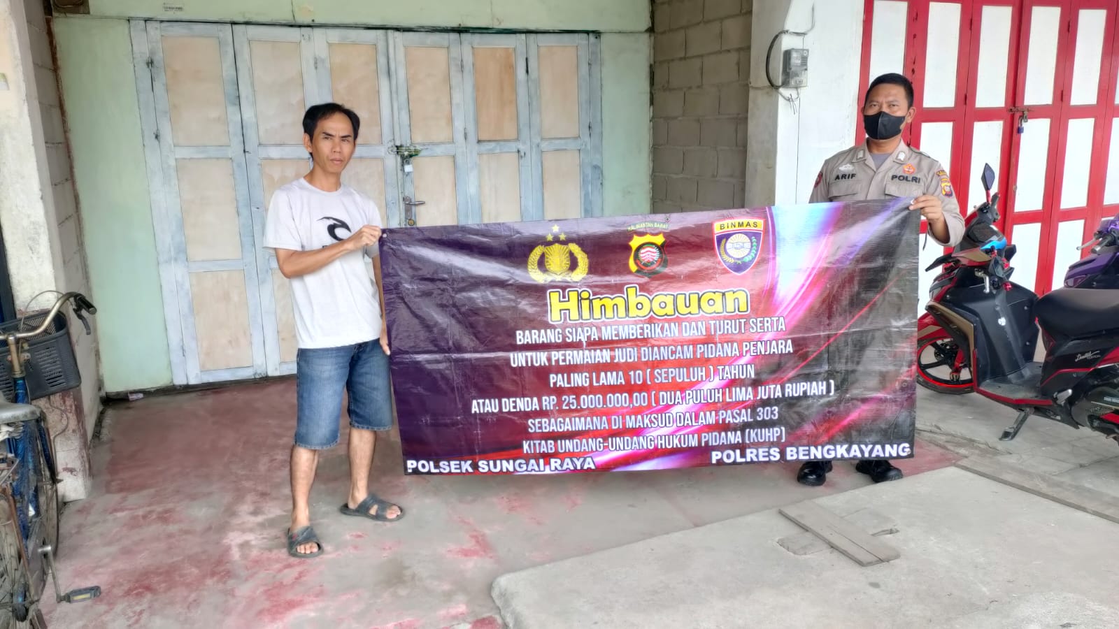 Pada kegiatan tersebut Personil Polsek Sungai Raya melaksanakan kegiatan dengan mengunakan Benner dengan isinya adalah, Himbauan’ Barang siapa memberikan dan turut serta untuk permainan judi diancam pidana penjara paling lama 10 (sepuluh) tahun atau denda 25.000.000,00 (dua puluh lima juta rupiah) sebagaimana dimaksud dalam pasal 303 Kitab undang – undang Hukum Pidana (KUHP)’.