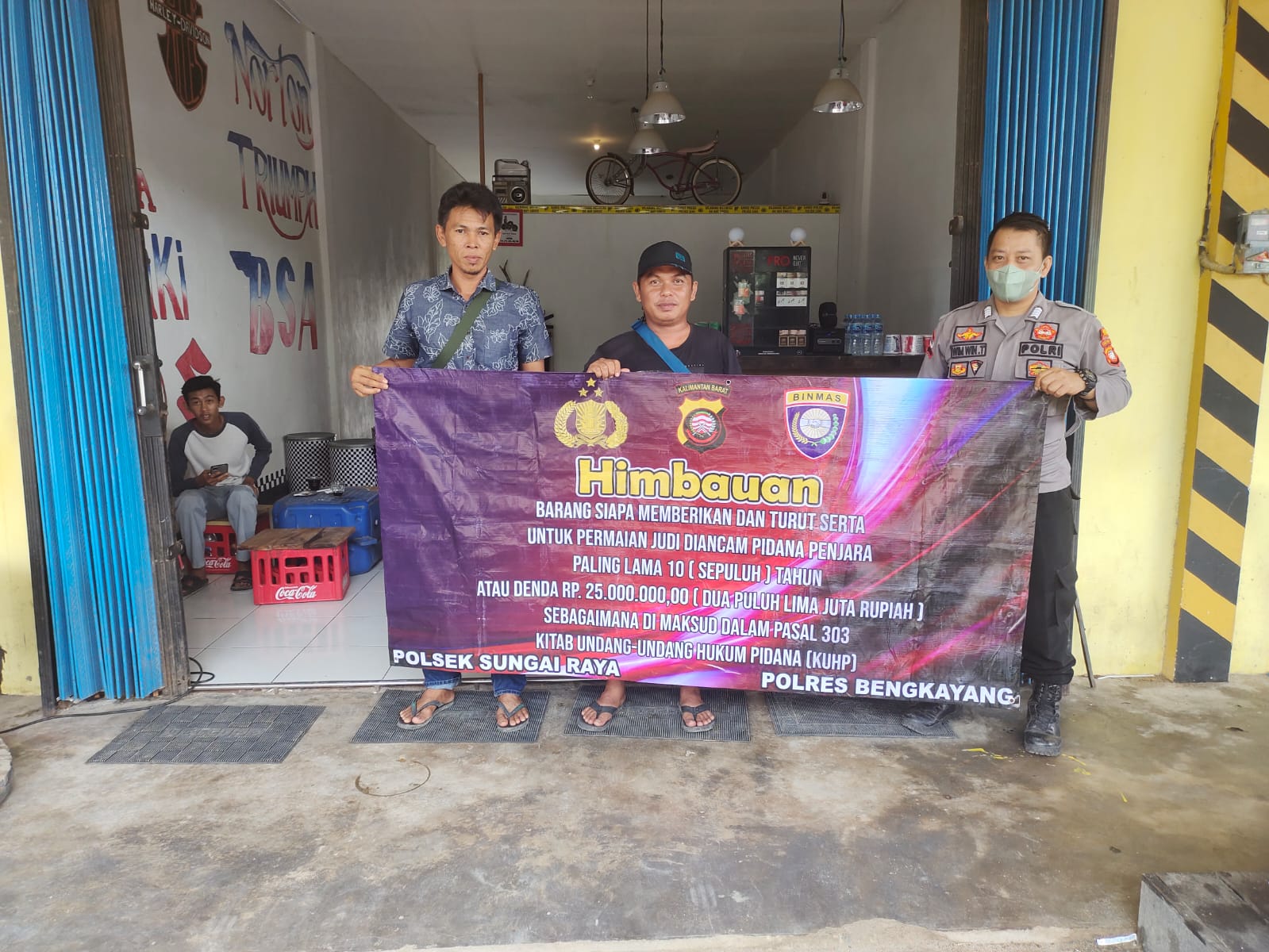 Pada kegiatan tersebut Personil Polsek Sungai Raya melaksanakan kegiatan dengan mengunakan Benner dengan isinya adalah, Himbauan’ Barang siapa memberikan dan turut serta untuk permainan judi diancam pidana penjara paling lama 10 (sepuluh) tahun atau denda 25.000.000,00 (dua puluh lima juta rupiah) sebagaimana dimaksud dalam pasal 303 Kitab undang – undang Hukum Pidana (KUHP)’.