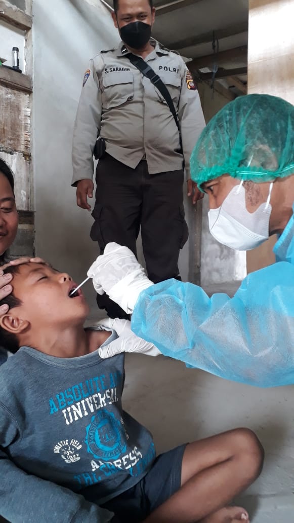 Personil polsek Teriak ikut dan mengawal jalannya kegiatan swab tes warga desa Dharma Bhakti yang memiliki kontak erat dengan penderita virus Covid-19.