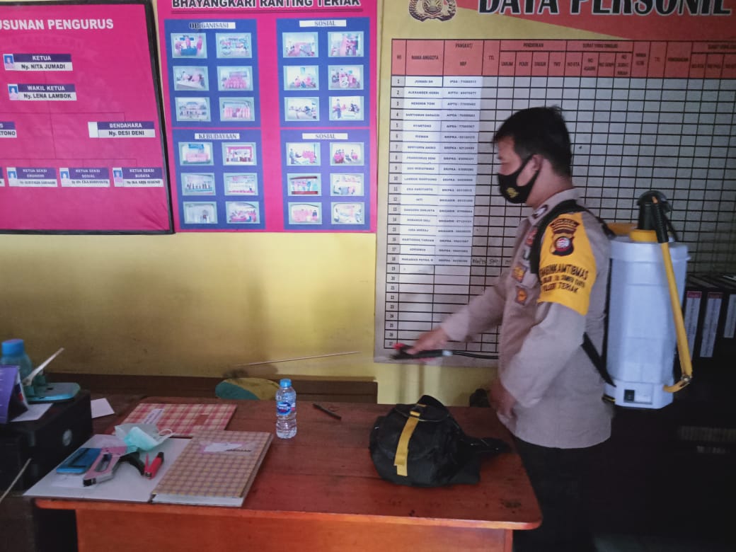 Salah satunya adalah dengan menyemprotkan cairan disinfektan di seluruh ruangan dan akses masuk yang ada di mako polsek Teriak.