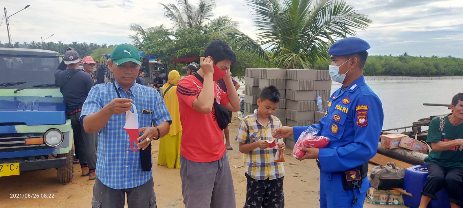 Sabtu,28 Agustus 2021,Personel Sat Polair Polres Bengkayang Polda Kalbar melaksanakan kegiatan pengawasan prokes kesehatan Covid-19 serta pembagian masker di Dermaga Teluk Suak.