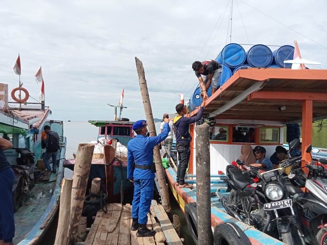 Personel Sat Polairud Polres Bengkayang yaitu Bripka Herman melaksanakan pembinaan masyarakat (Binmas) perairan dalam mengantisipasi terjadinya gangguan keamanan dan ketertiban masyarakat (Kamtibmas) serta melakukan pemantauan dan pengawasan aktivitas masyarakat di Dermaga penyebrangan kapal motor penumpang di Teluk Suak Desa Karimunting Kecamatan Sungai Raya Kepulauan Kabupaten Bengkayang, Minggu (28/11/2021).
