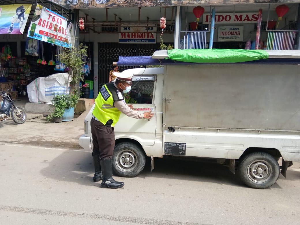 Kampanye keselamatan cegah covid 19 berupa penempelan stiker ini dilaksanakan setiap pagi saat melakukan kegiatan Gatur Lalu Lintas dan Penling.