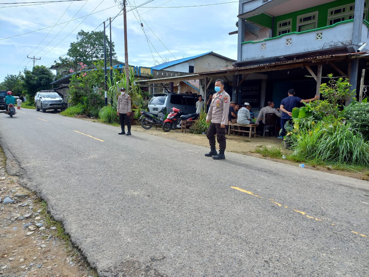 Ka Spkt 2 Polsek Ledo Aipda Wahyudi bersama Bhabinkamtibmas Bripka Minhat melaksanakan pengamanan dan pengaturan arus lalu lintas di depan rumah duka bertempat di Dsn Tanjung Desa Lesabela Kec Ledo Kab. Bengkayang, Sabtu (07/05/2022).