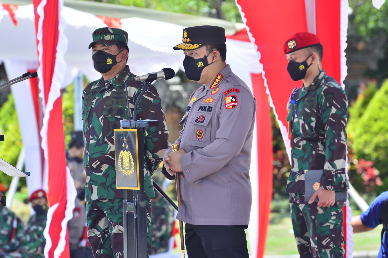 Bali – Panglima TNI Marsekal Hadi Tjahjanto dan Kapolri Jenderal Listyo Sigit Prabowo memimpin Apel gelar pasukan dalam rangka kesiapan penerimaan Wisatawan Mancanegara (Wisman) di Bandara Internasional I Gusti Ngurah Rai, Bali, Sabtu (23/10).