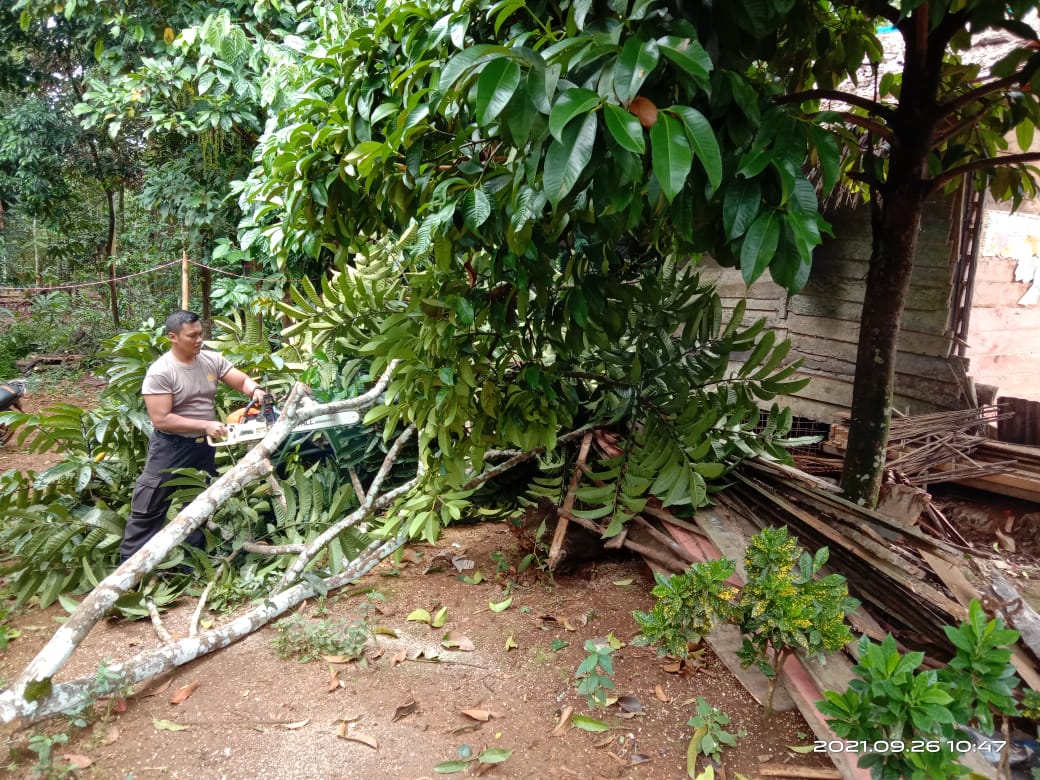 Sejumlah anggota kepolisian Sektor Sanggau Ledo membantu evakuasi pohon tumbang yang menimpa rumah milik Ambrosius Rafik (46) di Dsn.Panda RT 004/ RW 002 Desa Lembang, Kec.Sanggau Ledo Kab.Bengakyang KalBar, Minggu (29/09/2021) Jam.02.00 Wib dinihari.
