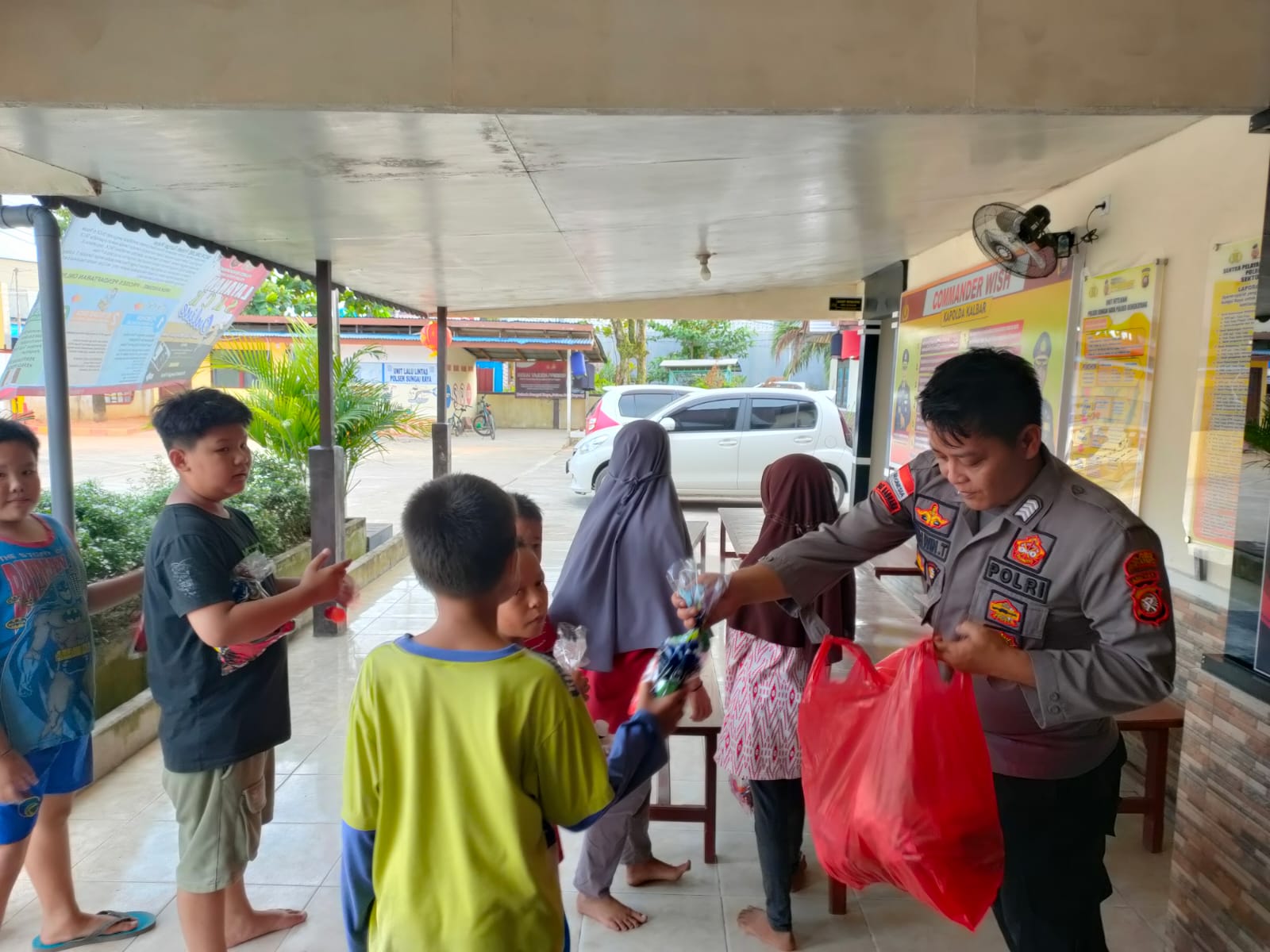 Cintanya Personil Polsek Sungai Raya terhadap anak anak tersebut yang bernama Bripka Wim Wim Tania memberikan bingkisan kepada anak anak yang sedang bermain dihalaman Polsek Sungai Raya.
