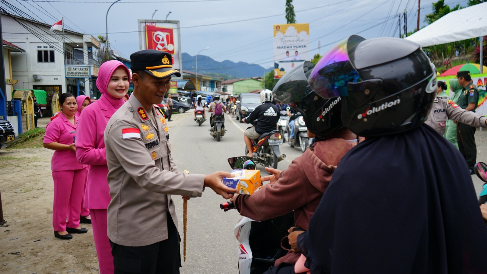 Ratusan kotak takjil dibagikan kepada masyarakat yang tengah dalam perjalanan menjelang waktu berbuka puasa. Masyarakat yang menerima takjil tampak antusias dan menyampaikan terima kasih atas perhatian yang diberikan oleh aparat TNI-Polri.