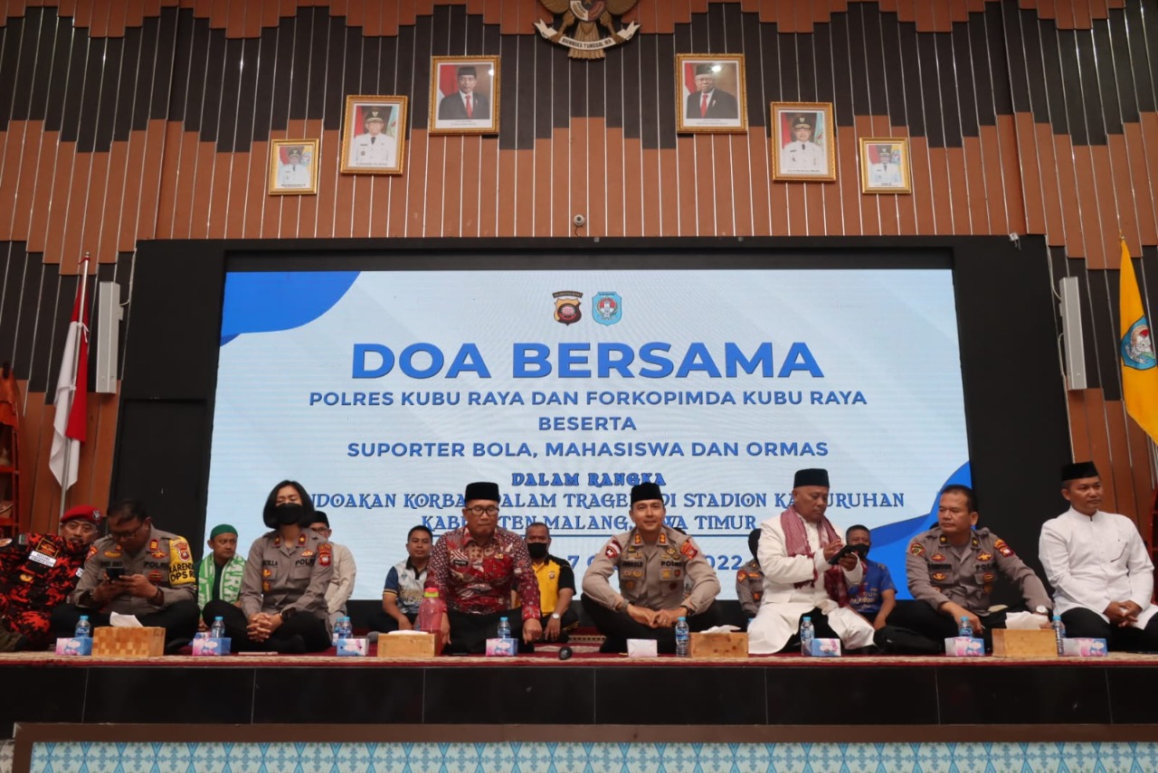 Kubu Raya – Wujud rasa duka cita yang mendalam untuk para korban tragedi di Stadion Kanjuruhan, Malang Jawa timur yang mengakibatkan korban jiwa suporter dan personil yang melaksanakan pengamanan, Polres Kubu Raya bersama Pemda Kubu Raya, Suporter Tim Sepak Bola, Mahasiswa, Ormas Kubu Raya menggelar Doa Bersama, dalam rangka mendoakan korban tragedi 1 Oktober 2022 di Aula Pemda Kabupaten Kubu Raya Jalan Arteri Supadio Kecamatan Sungai Raya Kabupaten Kubu Raya, Kalimantan Barat, Jumat (7/10/22) sore.