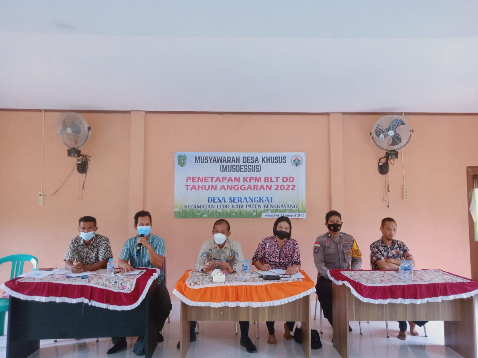 Kapolsek Ledo Ipda M. Rokhim memerintahkan personil Bhabinkamtibmas Polsek Ledo untuk menghadiri dan melaksanakan Pam dalam kegiatan musyawarah desa khusus penetapan blt-dd tahun 2022 yang bertempat di kantor desa Serangkat kecamatan ledo kabupaten bengkayang provinsi kalimantan barat, Sabtu (15/01/2022).