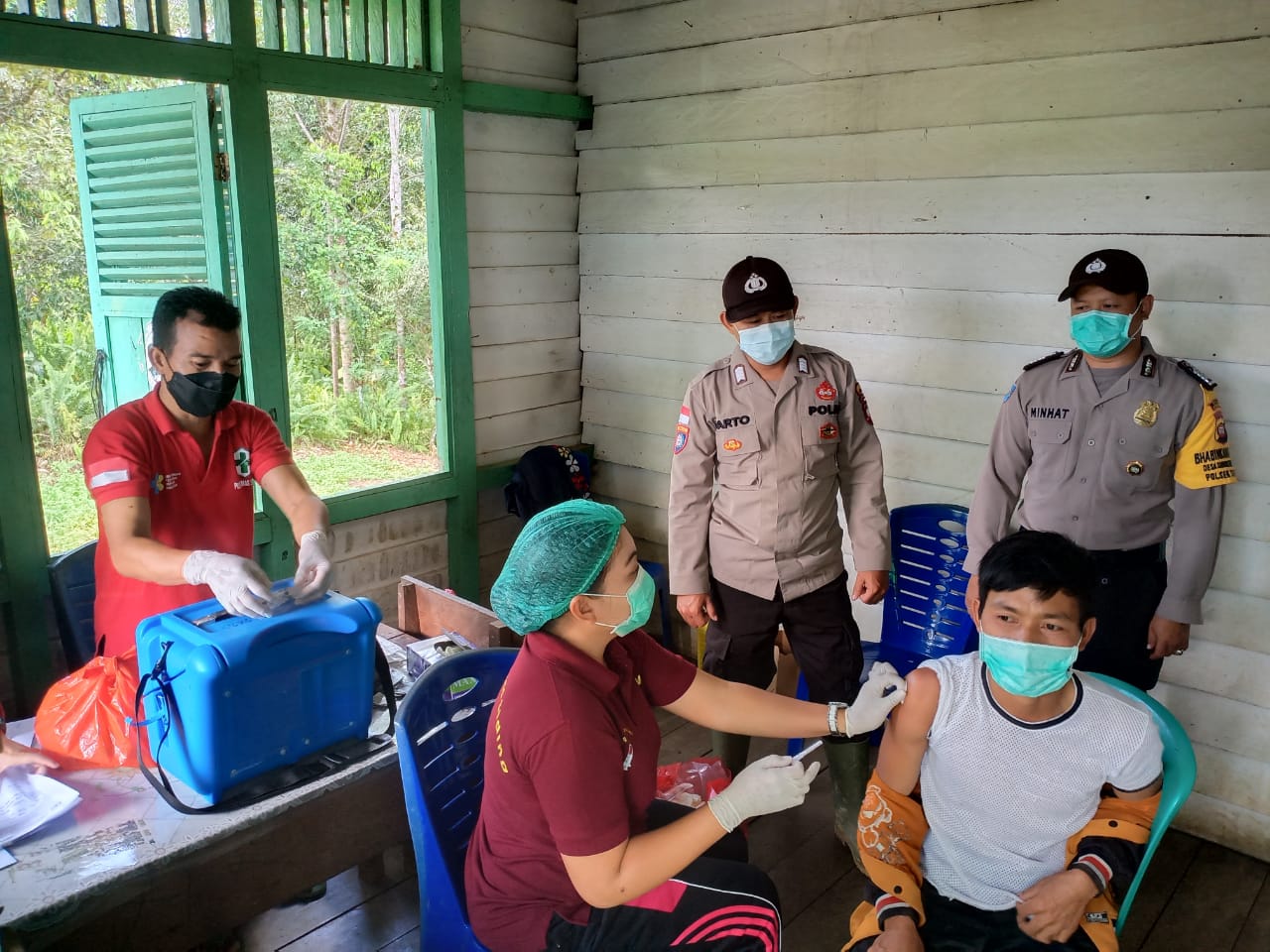 “Kegiatan vaksinasi dimulai dengan tahapan registrasi, pengecekan kesehatan kemudian dilanjutkan pemberian vaksin kepada warga desa serta pencetakan dan pemberian kartu vaksinasi” ujar sang Bhabinkamtibmas saat melaksanakan pengamanan vaksinasi yang tak henti hentinya juga menghimbau kepada warga untuk tetap menjaga protokol kesehatan saat berada di areal vaksin di desa.