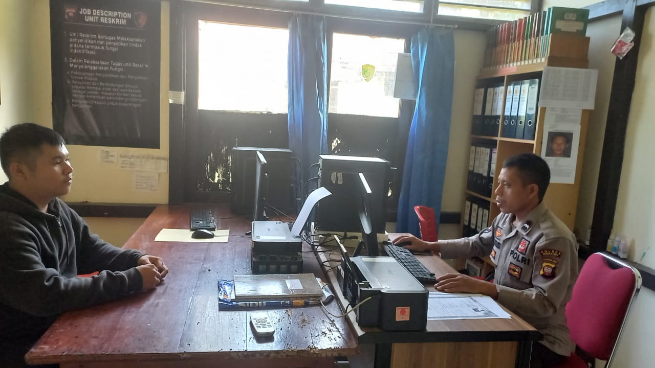 Terlihat KA SPKT 2 Aipda Wahyudi Polsek Ledo Polres Bengkayang Polda Kalbar sedang memberikan pelayanan yang humanis kepada warga masyarakat yang membuat Surat Kehilangan Barang berupa ATM ( Anjungan Tunai Mandiri) an.Romanius warga Dsn Ledo Kec. Ledo Kab. Bengkayang.