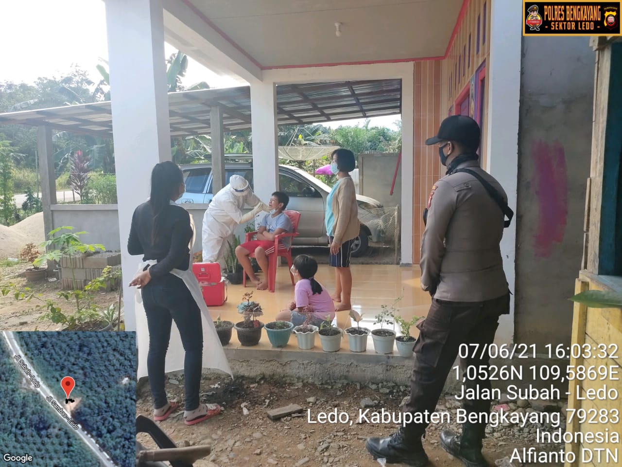 Sebagai tindak lanjut dari salah satu pasien yang konfirmasi positif Covid-19 yang berinisial Lks (35) Th , Mrtn (42) Th, Mrsl (12) Th, VR (8) Th, Bl (60) Th, yang merupakan Warga Desa Lesabela, untuk itu Polsek Ledo bersama Satgas Covid-19 Kecamatan Ledo melaksanakan giat tracing atau pelacak terhadap warga yang telah melakukan kontak erat dengan pasien pada Senin (07/06/2021). Pkl 14.00 Wib.