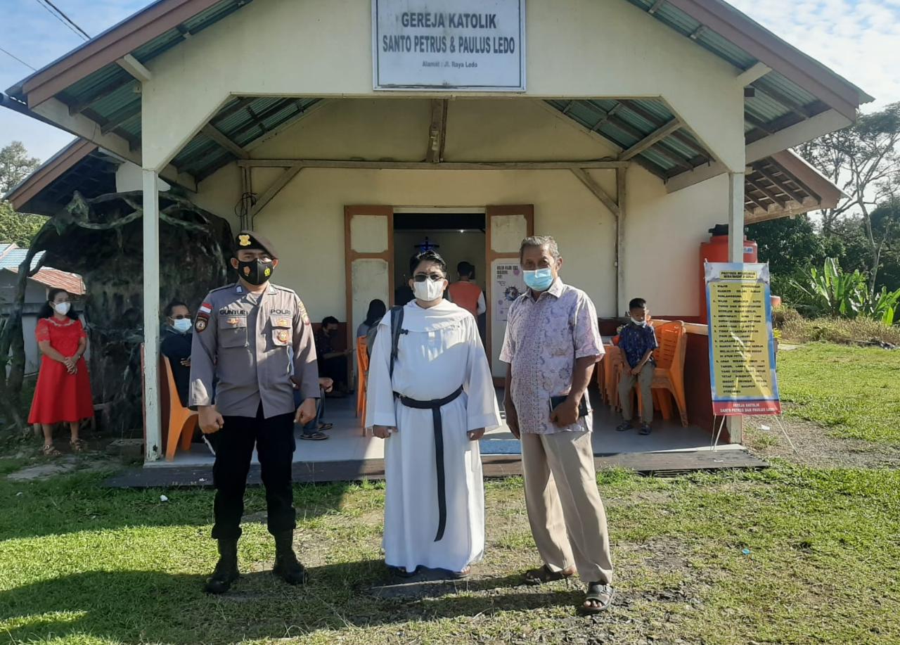 Kepolisian Sektor Ledo Polres Bengkayang Polda Kalbar selalu siap dalam memberikan pelayanan kepada masyarakat yang sedang melaksanakan ibadah Minggu seperti di gereja Katholik Santo Petrus dan Paulus yang berada di Dsn Ledo Desa Lesabela Kec Ledo Minggu (03/04/2022) Pkl. 08.00 Wib.