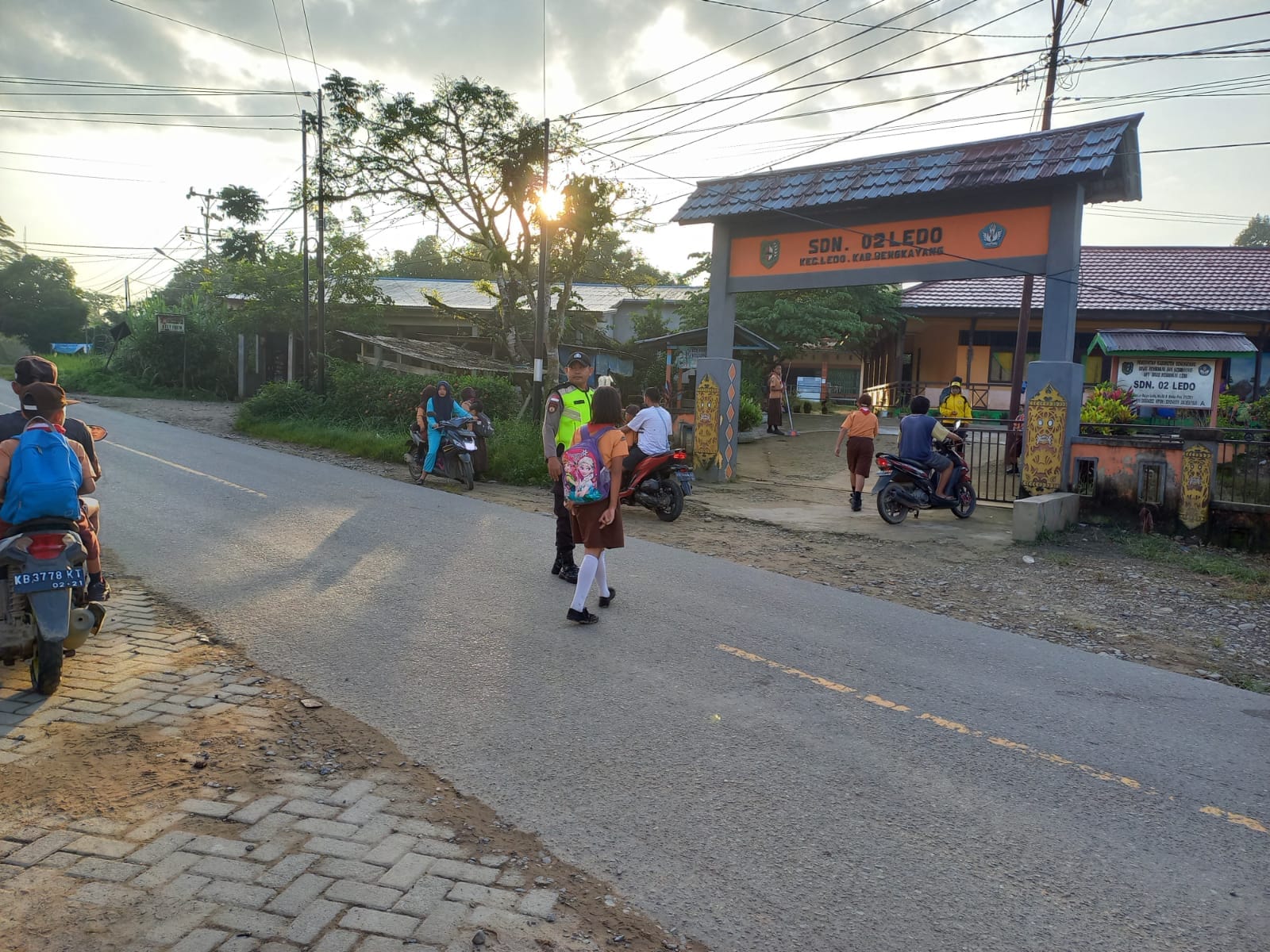 Tribratanews.polri.go.id – Ka SPKT Polsek Ledo Polres Bengkayang, Aipda Wahyudi dan Bripka Ignatius Guntur (Anggota Jaga), melaksanakan giat pengaturan Lalu Lintas di depan SD Negeri 02 Ledo, pada pukul.06.30 Wib.