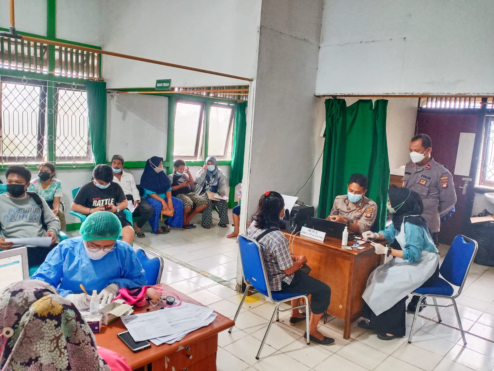 Kapolsek IPDA Kusnandar bersama anggota melaksanakan pengamanan dan monitoring jalanya kegiatan Vaksinasi yang mana pelaksanaan dibantu oleh Tenaga Kesehatan Puskesmas Kec. Monterado.