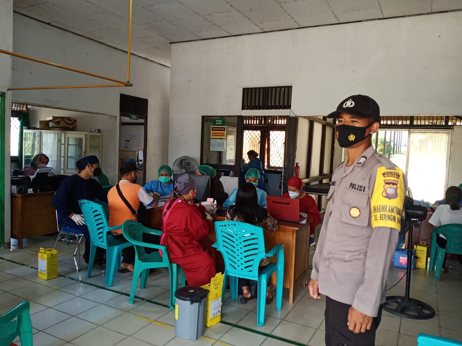polres bengkayang,polsek Monterado- Personel Polsek Monterado lakukan PAM dan monitoring pelaksanaan penyuntikan Vaksin Covid19 di Puskesmas Monterado.