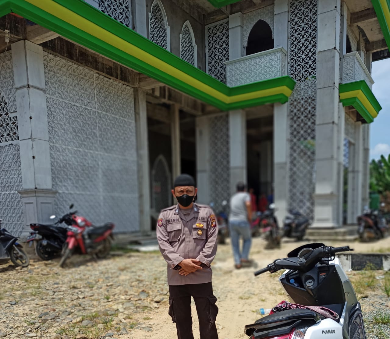 Personil polsek sanggau ledo yakni Bripka Wandi melaksanakan pam sholat Jumat di depan Masjid sambil memberi himbaun prokes 5 M dan himbauan kamtibmas kepada jamaah yang melaksanakan sholat jum’at.