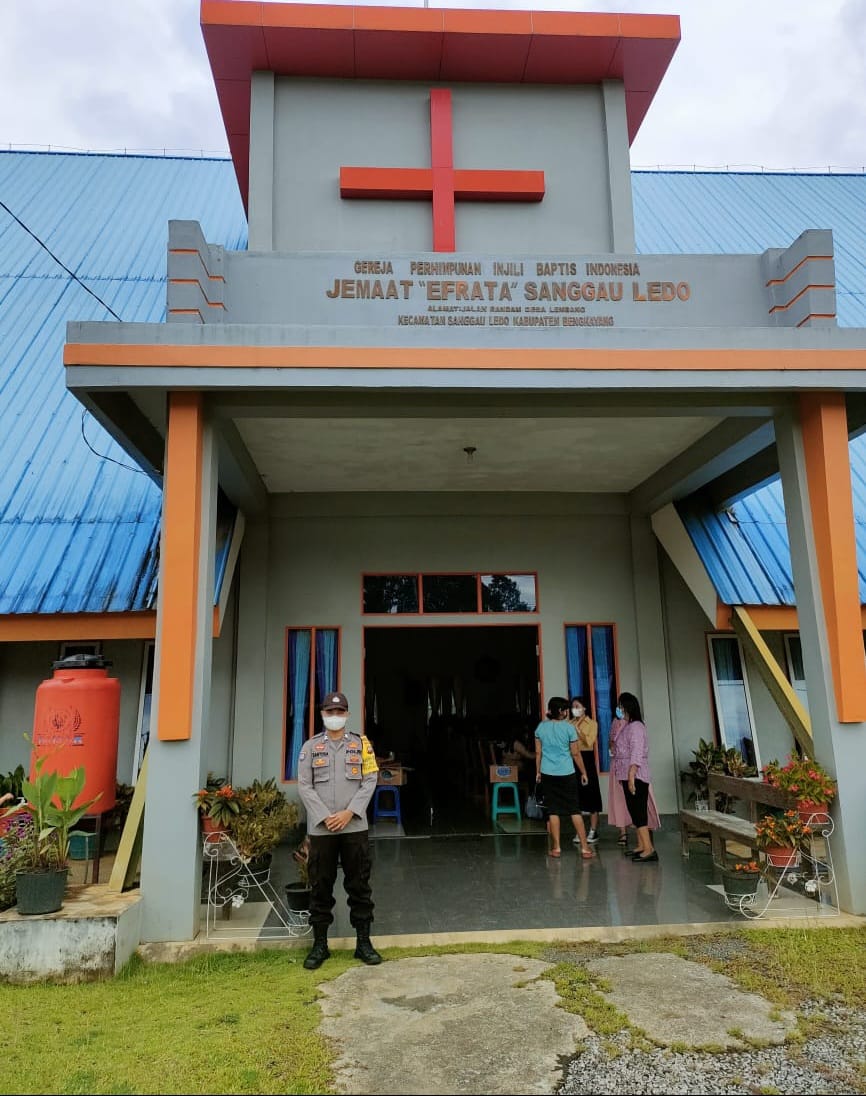 Personel Polsek Sanggau Ledo Briptu Davis melaksanakan pengamanan Gereja Effrata Desa Lembang Kecamatan Sanggau Ledo Kabuparen Bengkayang