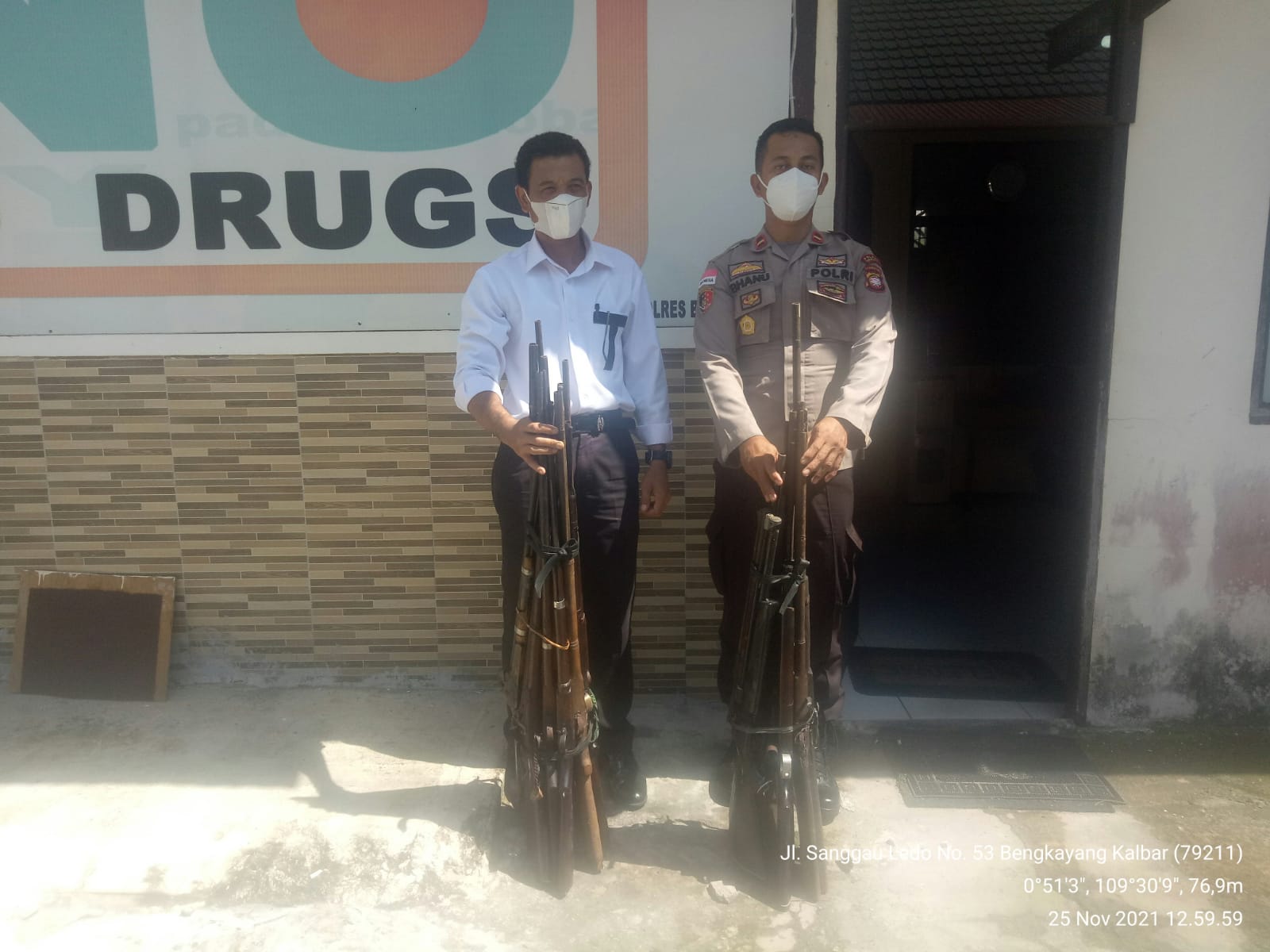 Polres Bengkayang – Sebanyak 23 pucuk senjata api Rakitan diserahkan Polsek Sanggau Ledo Polres Bengkayang Polda Kalbar kepada Sat Tahti Polres Bengkayang. Senpi ini diserahkan langsung oleh Kapolsek Sanggau Ledo IPDA Dwiyanto Bhanu Susilo, S.IP kepada Kasat Tahti Polres Bengkayang Aiptu Hendrik Toni, Kamis (25/11/2021).
