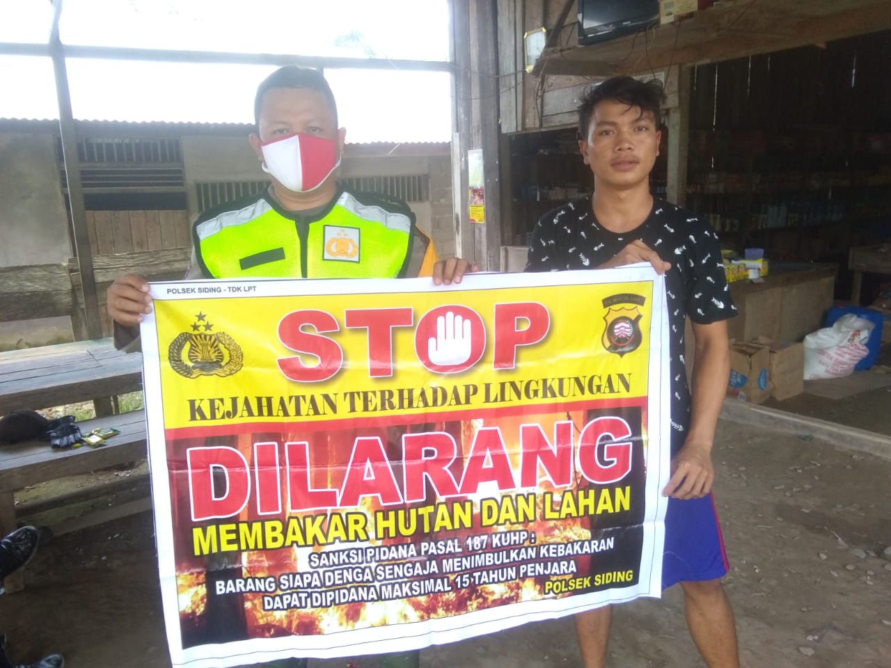 Untuk mencegah terjadinya Karhutla Personil Polsek Siding Bripka Minhat bersama Warga Desa Tangguh memberikan himbauan untuk STOP dan mencegah terjadinya kebakaran Hutan dan Lahan di Kecamatan Siding, Jumat (04/06/2021).