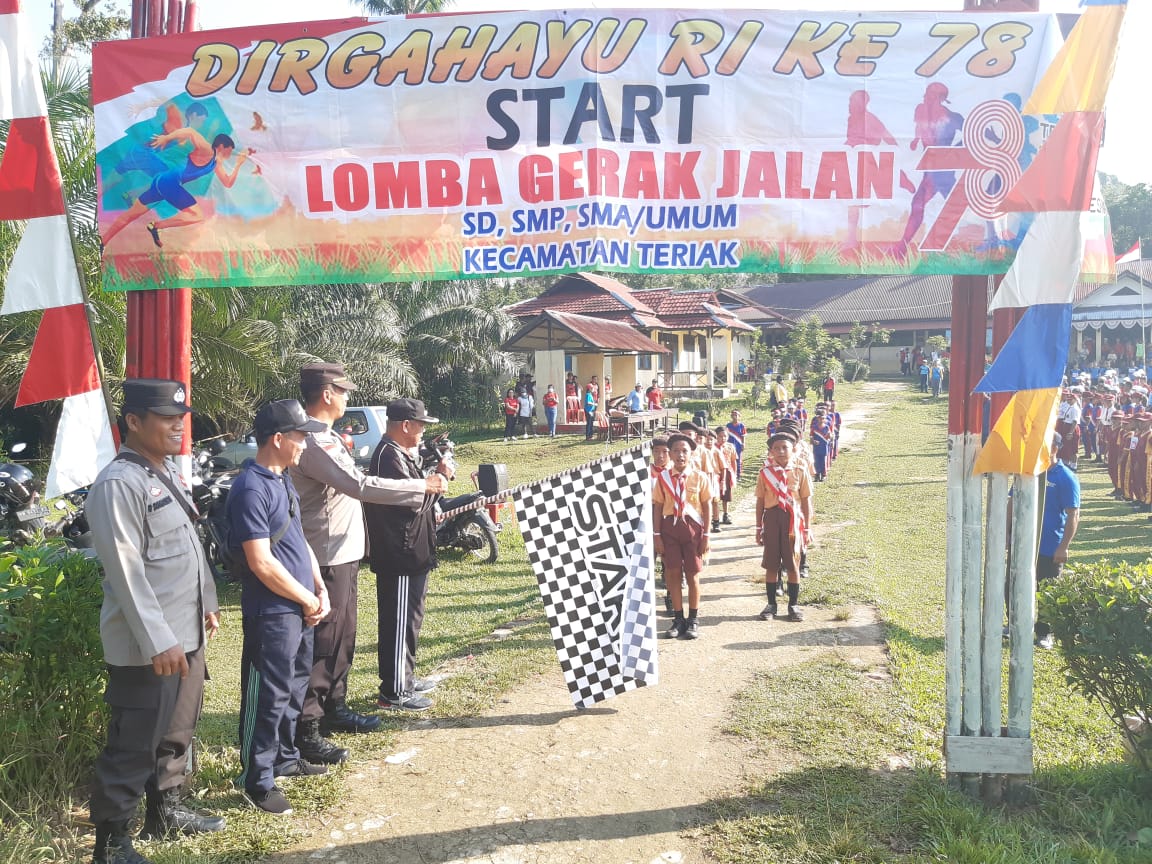 Polres Bengkayang, Polsek Teriak mengerahkan personelnya secara maksimal untuk mengamankan pelaksanaan gerak jalan tingkat SD, SMP, SMA dan Umum di wilayah Kecamatan Teriak Kabupaten Bengkayang. Kamis (10/08/2023)Pengaman itu dilakukan tentunya demi mendukung semaraknya kegiatan Gerak Jalan yang di selenggarakan oleh Kecamatan Teriak dalam rangka Memeriahkan HUT RI ke78, agar berjalan aman, lancar serta menjamin kenyamanan pengguna jalan lain yang harus rela mengikuti pengalihan arus selama kegiatan gerak Jalan berlangsung.Disela-sela kegiatan saat melepas peserta gerak jalan, Kapolsek Teriak Iptu Dwiyanto Bhanu Susilo S.I.P. mengatakan, “Kegiatan gerak jalan tingkat pelajar SD, SMP SMA dan Umum ini diselenggarakan untuk memeriahkan peringatan HUT Kemerdekaan Republik Indonesia ke-78,” ucap Kapolsek.“Personel diterjunkan ke lapangan untuk mengamankan serta mengatur lalu lintas sepanjang rute yang dilalui, mulai dari Start SD 09 Malo Jelayan sampai Finish depan kantor Kecamatan Teriak,” sambungnya.Menurutnya, “Dengan adanya kerja keras dan kerjasama dari semua pihak, kami berharap kegiatan ini dapat berjalan dengan lancar, sukses dan tanpa kendala apapun,” pungkasnya.