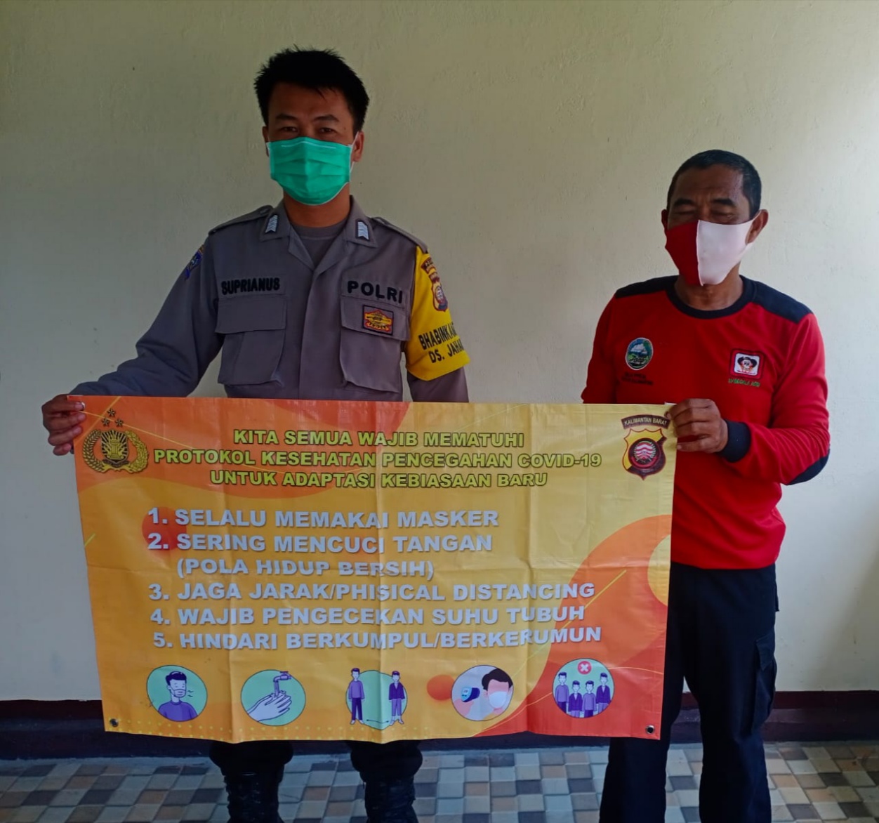 Bripka Suprianus dalam himbauannya mengingatkan warga agar selalu menerapkan Protokol Kesehatan 5M yaitu memakai masker, menjaga jarak, mencuci tangan, mengurangi mobilitas dan menghindari kerumunan.